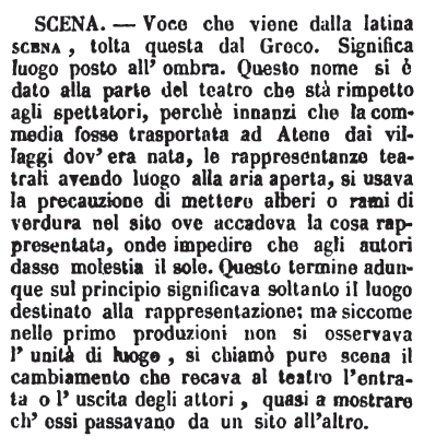 | Scena - Voce che viene dalla latina scena, tolta questa dal Greco. Significa luogo posto all'ombra. Questo nome si è dato alla parte del teatro che stà rimpetto agli spettatori, perchè innanzi che la commedia fosse trasportata ad Atene dai villaggi dov'era nata, le rappresentanze teatrali avendo luogo alla aria aperta, si usava la precauzione di mettere alberi o rami di verdura nel sito ove accadeva la cosa rappresentata, onde impedire che agli autori dasse molestia il sole. Questo termine adunque sul principio significava soltanto il luogo destinato alla rappresentazione; ma siccome nelle prime produzioni non si osservava l'unità di luogo, si chiamò pure scena il cambiamento che recava al teatro l'entrata o l'uscita degli attori, quasi a mostrare ch'essi passavano da un sito all'altro. [immagine] |