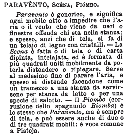 | Paravento, Scena, Piombo - Paravento è generico, e significa ogni mobile atto a impedire che l'aria o il vento che viene da usci o finestre offenda chi sta nella stanza; e spesso, anzi che di tela, si fa di un telajo di legno con cristalli. - La Scena è fatta o di tela o di carta dipinta, intelajata, ed è formata di più quadrati uniti mobilmente da poterla distendere e ripiegare. Serve al medesimo fine di parare l'aria, e spesso si distende facendone come un tramezzo a una stanza da servirsene per stanza da letto o per una specie di salotto. - Il Piombo (corruzione dello spagnuolo Biomba) è lo stesso che Paravento, ma è sempre di tela, e può essere anche di due o di tre quadrati mobili: è voce comune a Pistoja. [immagine] |