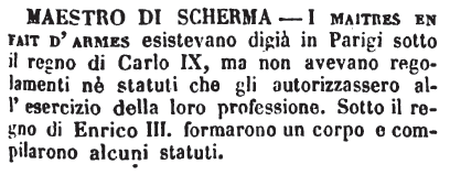 | Maestro di scherma - I maitres en fait d'armes esistevano digià in Parigi sotto il regno di Carlo IX, ma non avevano regolamenti nè statuti che gli autorizzasero all'esercizio della loro professione. Sotto il regno di Enrico III. formarono un corpo e compilarono alcuni statuti. [immagine] |