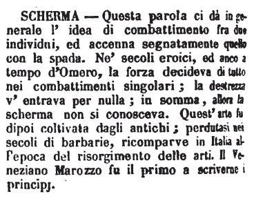 | Scherma - Questa parola ci dà in generale l'idea di combattimento fra due individui, ed accenna segnatamente quello con la spada. Ne' secoli eroici, ed anco a tempo d'Omero, la forza decideva di tutto nei combattimenti singolari; la destrezza v'entrava per nulla; in somma, allora la scherma non si conosceva. Quest'arte fu dipoi coltivata dagli antichi; perdutasi nei secoli di barbarie, ricomparve in Italia all'epoca del risorgimento delle arti. Il Veneziano Marozzo fu il primo a scriverne i principj. [immagine] |