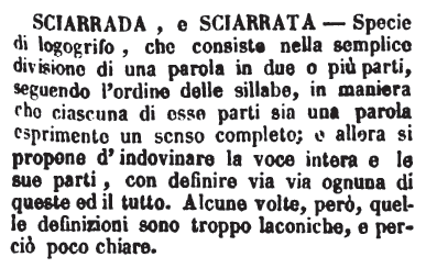 | Sciarrada e Sciarrata - Specie di logogrifo, che consiste nella semplice divisione di una parola in due o più parti, seguendo l'ordine delle sillabe, in maniera che ciascuna di esse parti sia una parola esprimente un senso completo; e allora si propone d'indovinare la voce intera e le sue parti, con definire via via ognuna di queste ed il tutto. Alcune volte, però, quelle definizioni sono troppo laconiche, e perciò poco chiare. [immagine] |