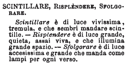 | Scintillare, Risplendere, Sfolgorare - Scintillare è di luce vivissima, tremula, e che sembri mandare scintille. - Risplendere è di luci grande, quieta, assai viva, e che illumina grande spazio. - Sfolgorare è di lue accesissima e grande che manda come lampi per ogni verso. [immagine] |