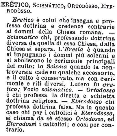 | Eretico, Scismatico, Ortodosso, Eterodosso - Eretico è colui che insegna e professa dottrina e credenze contrarie ai dommi della Chiesa romana. - Scismatico chi, professando dottrina diversa da quella di essa Chiesa, dalla Chiesa si separa. L'Eresia è quando si impugnano i dommi più solenni e si aboliscono le cerimonie principali del culto; lo Scisma quando la controversia cade su qualche accessorio, e il culto è conservato, ma con cerimonie e riti diversi. Lutero fu eretico; Fozio scismatico. - Ortodosso è chi professa la diretta e schietta dottrina religiosa. - Eterodosso chi professa dottrina falsa. Ma in questo caso chi per i cattolici è Eterodosso, si chiama da sè stesso Ortodosso, ed Eterodossi i cattolici; e così per contrario. [immagine] |