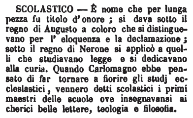 | Scolastico - E' nome che per lunga pezza fu titolo d'onore; si dava sotto il regno di Augusto a coloro che si distinguevano per l'eloquenza e la declamazione; sotto il regno di Nerone si applicò a quelli che studiavano legge e si dedicavano alla curia. Quando Carlomagno ebbe pensato di far tornare a fiorire gli studj ecclesiastici, vennero detti scolastici i primi maestri delle scuole ove insegnavansi ai cherici belle lettere, teologia e filosofia. [immagine] |
