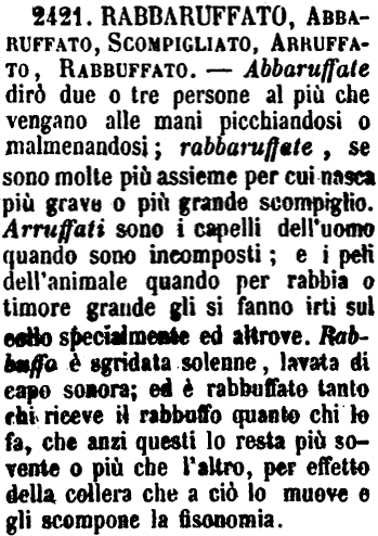 | Rabbaruffato, Abbaruffato, Scompigliato, Arruffato, Rabbuffato - Abbaruffate dirò due o tre persone al più che vengano alle mani picchiandosi o malmenandosi; rabbaruffate, se sono molte più assieme per cui nasca più grave o più grande scompiglio. Arruffati sono i capelli dell'uomo quando sono incomposti; e i peli dell'animale quando per rabbia o timore grande gli si fanno irti sul collo specialmente ed altrove. Rabbuffo è sgridata solenne, lavata di capo sonora; ed è rabbuffato tanto chi riceve il rabbuffo quanto chi lo fa, che anzi questi lo resta più sovente o più che l'altro, per effetto della collera che a ciò lo muove e gli scompone la fisionomia. [immagine] |