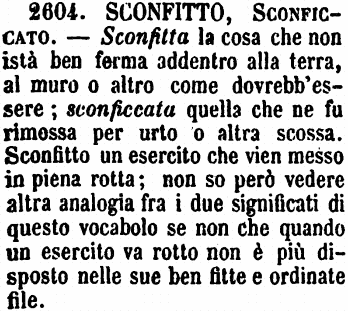 | Sconfitto, Sconficcato - Sconfitta la cosa che non istà ben ferma addentro alla terra, al muro o altro come dovrebb'essere; sconficcata quella che ne fu rimossa per urto o altra scossa. Sconfitto un esercito che vien messo in piena rotta; non so però vedere altra analogia fra i due significati di questo vocabolo se non che quando un esercito va rotto non è più disposto nelle sue ben fitte e ordinate file. [immagine] |