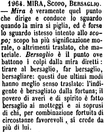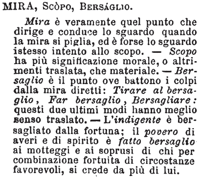 | Mira, Scopo, Bersaglio - Mira è veramente quel punto che dirige e conduce lo sguardo quando la mira si piglia, ed è forse lo sguardo istesso intento allo scopo. - Scopo ha più significazione morale, o altrimenti traslata, che materiale. - Bersaglio è il punto ove battono i colpi dalla mira diretti: Tirare al bersaglio, Far bersaglio, Bersagliare: questi due ultimi modi hanno meglio senso traslato. - L'indigente è bersagliato dalla fortuna; il povero di averi e di spirito è fatto bersaglio ai motteggi e ai soprusi di chi per combinazione fortuita di circostanze favorevoli, si crede da più di lui. [immagine] |