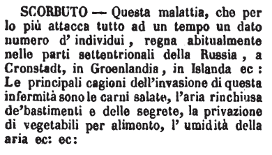 | Scorbuto - Questa malattia, che per lo più attacca tutto ad un tempo un dato numero d'individui, regna abitualmente nelle parti settentrionali della Russia, a Cronstadt, in Groenlandia, in Islanda ec: Le principali cagioni dell'invasione di questa infermità sono le carni salate, l'aria rinchiusa de' bastimenti e delle segrete, la privazione di vegetabili per alimento, l'umidità della aria ec: ec: [immagine] |