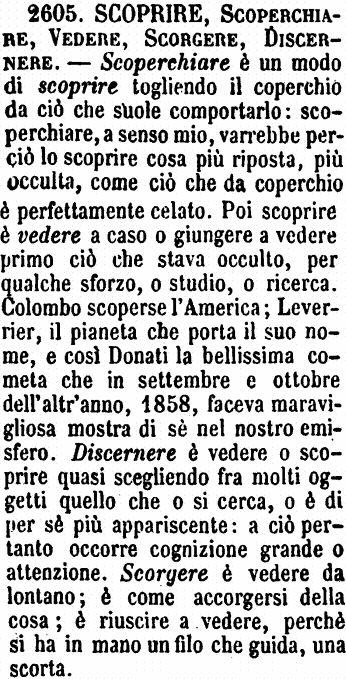| Scoprire, Scoperchiare, Vedere, Scorgere, Discernere - Scoperchiare è un modo di scoprire togliendo il coperchio da ciò che suole comportarlo: scoperchiare, a senso mio, varrebbe perciò lo scoprire cosa più riposta, più occulta, come ciò che da coperchio è perfettamente celato. Poi scoprire è vedere a caso o giungere a vedere primo ciò che stava occulto, per qualche sforzo, o studio, o ricerca. Colombo scoperse l'America; Leverrier, il pianeta che porta il suo nome, e così Donati la bellissima cometa che in settembre e ottobre dell'altr'anno, 1858, faceva maravigliosa mostra di sè nel nostro emisfero. Discernere è vedere o scoprire quasi scegliendo fra molti oggetti quello che o si cerca, o è di per sè più appariscente: a ciò pertanto occorre cognizione grande o attenzione. Scorgere è vedere da lontano; è come accorgersi della cosa; è riuscire a vedere, perchè si ha in mano un filo che guida, una scorta. [immagine] |