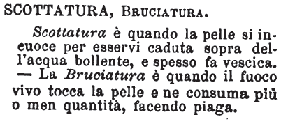 | Scottatura, Bruciatura - Scottatura è quando la pelle si incuoce per esservi caduta sopra dell'acqua bollente, e spesso fa vescica. - La Bruciatura è quando il fuoco vivo tocca la pelle e ne consuma più o men quantità, facendo piaga. [immagine] |