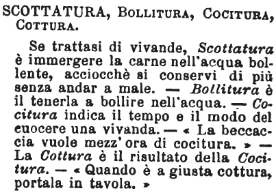 | Scottatura, Bollitura, Cocitura, Cottura - Se trattasi di vivande, Scottatura è immergere la carne nell'acqua bollente, acciocchè si conservi di più senza andar a male. - Bollitura è il tenerla a bollire nell'acqua. - Cocitura indica il tempo e il modo del cuocere una vivanda. - «La beccaccia vuole mezz'ora di cocitura.» - La Cottura è il risultato della Cocitura. - «Quando è a giusta cottura, portala in tavola.» [immagine] |