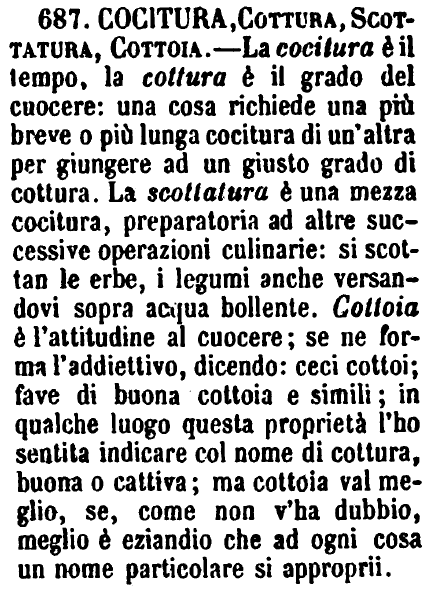 | Cocitura, Cottura, Scottatura, Cottoia - La cocitura è il tempo, la cottura è il grado del cuocere: una cosa richiede una più breve o più lunga cocitura di un'altra per giungere ad un giusto grado di cottura. La scottatura è una mezza cocitura, preparatoria ad altre successive operazioni culinarie: si scottan le erbe, i legumi anche versandovi sopra acqua bollente. Cottoia è l'attitudine al cuocere; se ne forma l'addiettivo, dicendo: ceci cottoi; fave di buona cottoia e simili; in qualche luogo questa proprietà l'ho sentita indicare col nome di cottura, buona o cattiva; ma cottoia val meglio, se, come non v'ha dubbio, meglio è eziandio che ad ogni cosa un nome particolare si approprii. [immagine] |