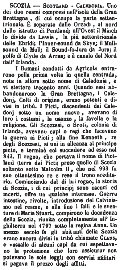 Scozia - Scotland - Caledonia - Uno dei due reami compresi nell'isola della Gran Brettagna, di cui occupa la parte settentrionale. E' separato dalle Orcadi, al nord dallo istretto di Pentland; all'Ovest il Minch lo divide da Lewis, la più settentrionale delle Ebridi; l'Inner-sound da Skye; il Mull-sound da Mull; il Sound-fo-Jura da Jura; il golfo di Clyde da Arran; e il canale del Nord dall'Irlanda.
