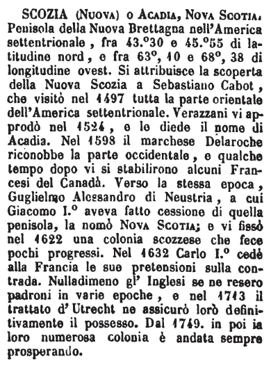 | Scozia (nuova) o Acadia, Nova Scotia - Penisola della Nuova Brettagna nell'America settentrionale, fra 43.°30 e 45.°55 di latitudine nord, e fra 63°, 10 e 68°,38 di longitudine ovest. Si attribuisce la scoperta della Nuova Scozia a Sebastiano Cabot, che visitò nel 1497 tutta la parte orientale dell'America settentrionale. Verazzani vi approdò nel 1524, e le diede il nome di Acadia. Nel 1598 il marchese Delaroche riconobbe la parte occidentale, e qualche tempo dopo vi si stabilirono alcuni Francesi del Canadà. Verso la stessa epoca, Guglielmo Alessandro di Neustria, a cui Giacomo I.° aveva fatto cessione di quella penisola, la nomò Nova Scotia; e vi fissò nel 1622 una colonia scozzese che fece pochi progressi. Nel 1632 Carlo I.° cedè alla Francia le sue pretensioni sulla contrada. Nulladimeno gl'Inglesi se ne resero padroni in varie epoche, e nel 1713 il trattato d'Utrecht ne assicurò loro definitivamente il possesso. Dal 1749. in poi la loro numerosa colonia è andata sempre prosperando. [immagine] |