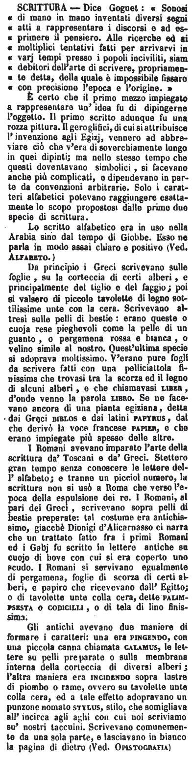 | Scrittura - Dice Goguet: «Sonosi di mano in mano inventati diversi segni atti a rappresentare i discorsi e ad esprimere il pensiero. Alle ricerche ed ai molteplici tentativi fatti per arrivarvi in varj tempi presso i popoli inciviliti, siam debitori dell'arte di scrivere, propriamente detta, della quale è impossibile fissare con precisione l'epoca e l'origine.»