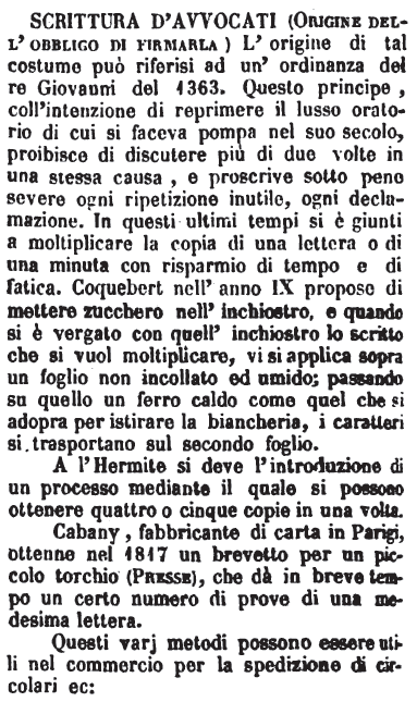 | Scrittura d’avvocati (Origine dell'obbligo di firmarla) - L'origine di tal costume può riferirsi ad un'ordinanza del re Giovanni del 1363. Questo principe, coll'intenzione di reprimere il lusso oratorio di cui si faceva pompa nel suo secolo, proibisce di discutere più di due volte in una stessa causa, e proscrive sotto pene severe ogni ripetizione inutile, ogni declamazione. In questi ultimi tempi si è giunti a moltiplicare la copia di una lettera o di una minuta con risparmio di tempo e di fatica. Coquebert nell'anno IX propose di mettere zucchero nell'inchiostro, e quando si è vergato con quell'inchiostro lo scritto che si vuol moltiplicare, vi si applica sopra un foglio non incollato ed umido; passando su quello un ferro caldo come quel che si adopra per istirare la biancheria, i caratteri si trasportano sul secondo foglio.