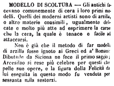 | Modello di scoltura - Gli antichi facevano comunemente di cera i loro primi modelli. Quelli dei moderni artisti sono di arzilla, o altre materie consimili, ugualmente delicate e molto più atte ad esprimere la carne che la cera, la quale è tenace e facile ad attaccarsi.