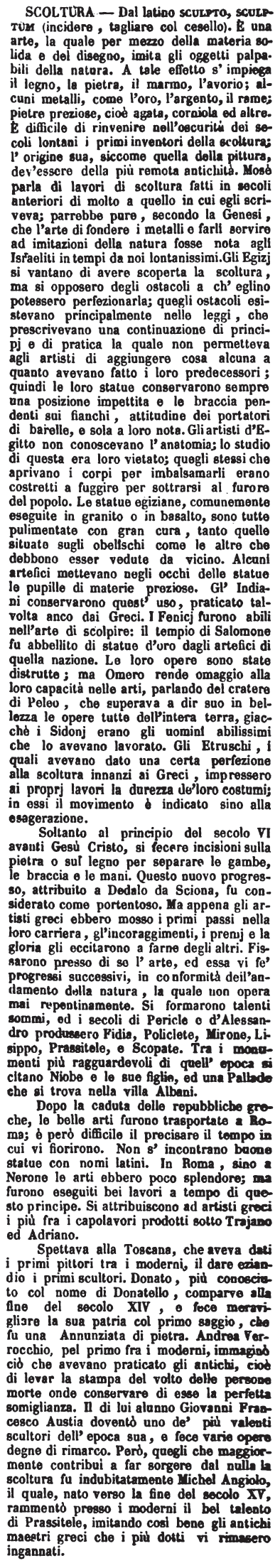 | Scoltura - Dal latino sculpto, sculptum (incidere, tagliare col cesello). È una arte, la quale per mezzo della materia solida e del disegno, imita gli oggetti palpabili della natura. A tale effetto s'impiega il legno, la pietra, il marmo, l'avorio; alcuni metalli, come l'oro, l'argento, il rame; pietre preziose, cioè agata, corniola ed altre. È difficile di rinvenire nell'oscurità dei secoli lontani i primi inventori della scoltura; l'origine sua, siccome quella della pittura, dev'essere della più remota antichità. Mosè parla di lavori di scoltura fatti in secoli anteriori di molto a quello in cui egli scriveva; parrebbe pure, secondo la Genesi, che l'arte di fondere i metalli e farli servire ad imitazioni della natura fosse nota agli Israeliti in tempi da noi lontanissimi. Gli Egizj si vantano di avere scoperta la scoltura, ma si opposero degli ostacoli a ch'eglino potessero perfezionarla; quegli ostacoli esistevano principalmente nelle leggi, che prescrivevano una continuazione di principj e di pratica la quale non permetteva agli artisti di aggiungere cosa alcuna a quanto avevano fatto i loro predecessori; quindi le loro statue conservarono sempre una posizione impettita e le braccia pendenti sui fianchi, attitudine dei portatori di barelle, e sola a loro nota. Gli artisti d'Egitto non conoscevano l'anatomia; lo studio di questa era loro vietato; quegli stessi che aprivano i corpi per imbalsamarli erano costretti a fuggire per sottrarsi al furore del popolo. Le statue egiziane, comunemente eseguite in granito o in basalto, sono tutte pulimentate con gran cura, tanto quelle situate sugli obelischi come le altre che debbono esser vedute da vicino. Alcuni artefici mettevano negli occchi delle statue le pupille di materie preziose. Gl'Indiani conservarono quest'uso, praticato talvolta anco dai Greci. I Fenicj furono abili nell'arte di scolpire: il tempio di Salomone fu abbellito di statue d'oro dagli artefici di quella nazione. Le loro opere sono state distrutte; ma Omero rende omaggio alla loro capacità nelle arti, parlando del cratere di Peleo, che superava a dir suo in bellezza le opere tutte dell'intera terra, giacchè i Sidonj erano gli uomini abilissimi che lo avevano lavorato. Gli Etruschi, i quali avevano dato una certa perfezione alla scoltura innanzi ai Greci, impressero ai proprj lavori la durezza de' loro costumi; in essi il movimento è indicato sino alla esagerazione.