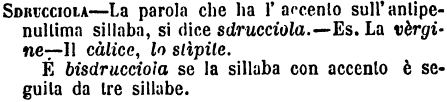 | Sdrucciola - La parola che ha l'accento sull'antipenultima sillaba, si dice sdrucciola. - Es. La vèrgine - Il càlice, lo stìpite.