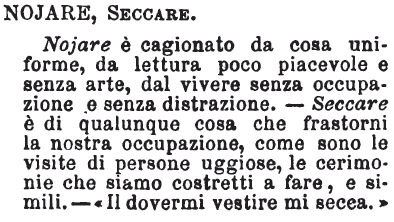 | Nojare, Seccare - Nojare è cagionato da cosa uniforme, da lettura poco piacevole e senza arte, dal vivere senza occupazione e senza distrazione.- Seccare è di qualunque cosa che frastorni la nostra occupazione, come lo sono le visite di persone uggiose, le cerimonie che siamo costretti a fare, e simili.- «Il dovermi vestire mi secca.» [immagine] |