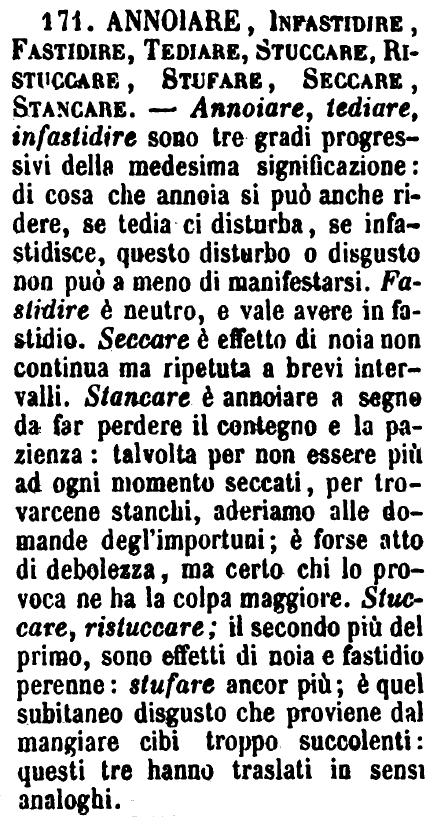 | Annoiare, Infastidire, Fastidire, Tediare, Stuccare, Ristuccare, Stufare, Seccare, Stancare - Annoiare, tediare, infastidire sono tre gradi progressivi della medesima significazione: di cosa che annoia si può anche ridere, se tedia ci disturba, se infastidisce, questo disturbo o disgusto non può a meno di manifestarsi. Fastidire è neutro, e vale avere in fastidio. Seccare è effetto di noia non continua ma ripetuta a brevi intervalli. Stancare è annoiare a segno da far perdere il contegno e la pazienza: talvolta per non essere più ad ogni momento seccati, per trovarcene stanchi, aderiamo alle domande degl'importuni; è forse atto di debolezza, ma certo chi lo provoca ne ha la colpa maggiore. Stuccare, ristuccare; il secondo più del primo, sono effetti di noia e fastidio perenne: stufare ancor più; è quel subitaneo disgusto che proviene dal mangiare cibi troppo succolenti: questi tre hanno traslati in sensi analoghi. [immagine] |