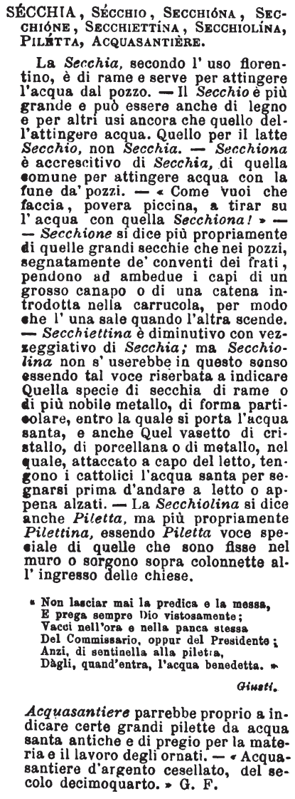 | Secchia, Secchio, Secchiona, Secchione, Secchiettina, Secchiolina, Piletta, Acquasantiere - La Secchia, secondo l'uso fiorentino, è di rame e serve per attingere l'acqua dal pozzo. - Il Secchio è più grande e può essere anche di legno e per altri usi ancora che quello dell'attingere acqua. Quello per il latte Secchio, non Secchia. - Secchiona è accrescitivo di Secchia, di quella comune per attingere acqua con la fune da' pozzi. - «Come vuoi che faccia, povera piccina, a tirar su l'acqua con quella Secchiona!» - Secchione si dice più propriamente di quelle grandi secchie che nei pozzi, segnatamente de' conventi dei frati, pendono ad ambedue i capi di un grosso canapo o di una catena introdotta nella carrucola, per modo che l'una sale quando l'altra scende. - Secchiettina è diminutivo con vezzeggiativo di Secchia; ma Secchiolina non s'userebbe in questo senso essendo tal voce riserbata a indicare Quella specie di secchia di rame o di più nobile metallo, di forma particolare, entro la quale si porta l'acqua santa, e anche Quel vasetto di cristallo, di porcellana o di metallo, nel quale, attaccato a capo del letto, tengono i cattolici l'acqua santa per segnarsi prima d'andare a letto o appena alzati. - La Secchiolina si dice anche Piletta, ma più propriamente Pilettina, essendo Piletta voce speciale di quelle che sono fisse nel muro o sorgono sopra colonnette all'ingresso delle chiese.