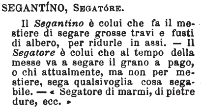 | Segantino, Segatore - Il Segantino è colui che fa il mestiere di segare grosse travi e fusti di albero, per ridurle in assi. - Il Segatore è colui che al tempo della messe va a segare il grano a pago, o chi attualmente, ma non per mestiere, sega qualsivoglia cosa segabile. - «Segatore di marmi, di pietre dure, ecc.» [immagine] |