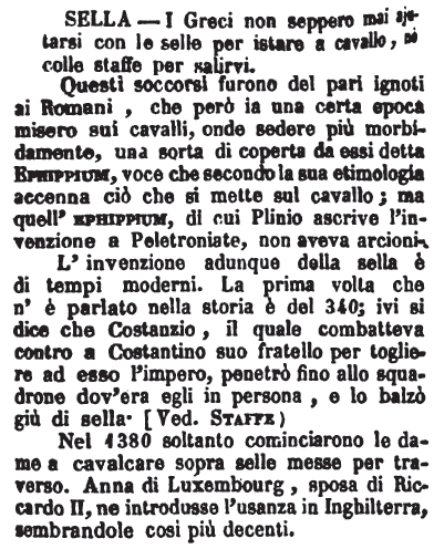 Questi soccorsi furono del pari ignoti ai Romani, che però in una certa epoca misero sui cavalli, onde sedere più morbidamente, una sorta di coperta da essi detta Ephippium, voce che secondo la sua etimologia accenna ciò che si mette sul cavallo; ma quell'ephippium, di cui Plinio ascrive l'invenzione a Peletroniate, non aveva arcioni. L'invenzione adunque della sella è di tempi moderni. La prima volta che n'è parlato nella storia è del 340; ivi si dice che Costanzio, il quale combatteva contro a Costantino suo fratello per togliere ad esso l'impero, penetrò fino allo squadrone dov'era egli in persona, e lo balzò giù di sella [Ved. Staffe] Nel 1380 soltanto cominciarono le dame a cavalcare sopra selle messe per traverso. Anna di Luxembourg, sposa di Riccardo II, ne introdusse l'usanza in Inghilterra, sembrandole così più decenti. [immagine] |