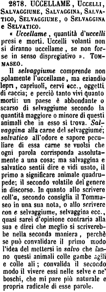 Il selvaggiume comprende non solamente l'uccellame, ma eziandio lepri, capriuoli, cervi ecc., oggetti di caccia; e perciò tanto vivi quanto morti: un paese è abbondante o scarso di selvaggiume secondo la quantità maggiore o minore di questi animali che in esso si trova. Salvaggina alla carne del selvaggiume; salvatico all'odore e sapore peculiare di essa carne se vuolsi che ogni parola corrisponda assolutamente a una cosa; ma salvaggina e salvatico sentii dire e vidi usato, il primo a significare animale quadrupede; il secondo volatile del genere in discorso. In quanto allo scrivere coll'a, secondo consiglia il Tommaseo in una sua nota, o allo scrivere con e selvaggiume, selvaggina ecc., quasi sarei d'opinione contraria alla sua e direi che meglio si scriverebbe nella seconda maniera, perchè se può convalidare il primo modo l'idea del mettersi in salvo che fanno questi animali colle gambe agili e colle ali; convalida il secondo modo il vivere essi nelle selve e ne' boschi, che mi pare più naturale e propria radicale di esse parole. [immagine] |