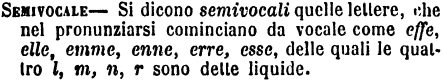 | Semivocale - Si dicono semivocali quelle lettere, che nel pronunziarsi cominciano da vocale come effe, elle, emme, enne, erre, esse, delle quali le quattro l, m, n, r sono dette liquide. [immagine] |