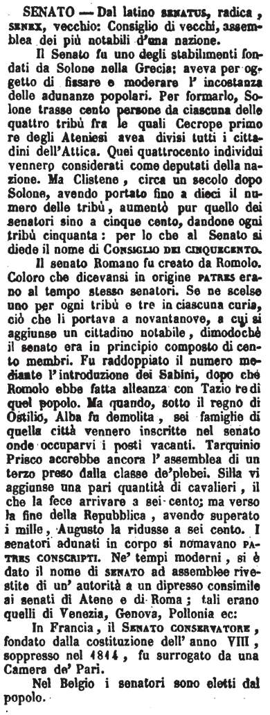 Il Senato fu uno degli stabilimenti fondati da Solone nella Grecia; aveva per oggetto di fissare e moderare l'incostanza delle adunanze popolari. Per formarlo, Solone trasse cento persone da ciascuna delle quattro tribù fra le quali Cecrope primo re degli Ateniesi avea divisi tutti i cittadini dell'Attica. Quei quattrocento individui vennero considerati come deputati della nazione. Ma Clistene, circa un secolo dopo Solone, avendo portato fino a dieci il numero delle tribù, aumentò pur quello dei senatori sino a cinque cento, dandone ogni tribù cinquanta: per lo che al Senato si diede il nome di Consiglio dei cinquecento. Il senato Romano fu creato da Romolo. Coloro che dicevansi in origine patres erano al tempo stesso senatori. Se ne scelse uno per ogni tribù e tre in ciascuna curia, ciò che li portava a novantanove, a cui si aggiunse un cittadino notabile, dimodochè il senato era in principio composto di cento membri. Fu raddoppiato il numero mediante l'introduzione dei Sabini, dopo che Romolo ebbe fatta alleanza con Tazio re di quel popolo. Ma quando, sotto il regno di Ostilio, Alba fu demolita, sei famiglie di quella città vennero inscritte nel senato onde occuparvi i posti vacanti. Tarquinio Prisco accrebbe ancora l'assemblea di un terzo preso dalla classe de' plebei. Silla vi aggiunse una pari quantità di cavalieri, il che la fece arrivare a sei cento; ma verso la fine della Repubblica, avendo superato i mille, Augusto la ridusse a sei cento. I senatori adunati in corpo si nomavano patres conscripti. Ne' tempi moderni, si è dato il nome di senato ad assemblee rivestite di un'autorità a un dipresso consimile ai senati di Atene e di Roma; tali erano quelli di Venezia, Genova, Pollonia ec: In Francia, il Senato conservatore, fondato dalla costituzione dell'anno VIII, soppresso nel 1814, fu surrogato da una Camera de' Pari. Nel Belgio i senatori sono eletti dal popolo. [immagine] |