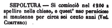 | Sepoltura - Si cominciò nel 1200 a spellire nelle chiese, e quest'uso pernicioso si mantenne per circa sei cento anni (Ved. Cimitero) [immagine] |