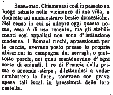 | Serraglio - Chiamavasi così in passato un luogo situato nelle vicinanze di una villa, e dedicato ad ammaestrare bestie domestiche. Nel senso in cui si adopra oggi questo nome, esso è di uso recente, ma gli stabilimenti così appellati non sono d'istituzione moderna. I Romani ricchi, appassionati per la caccia, avevano posto presso le proprie abitazioni in campagna dei serragli, o piuttosto parchi, nei quali mantenevano d'ogni sorta di animali. I re di Francia della prima e seconda stirpe, dilettandosi a veder combattere le fiere, tenevano con grave spesa tali locali in prossimità delle loro castella. [immagine] |
