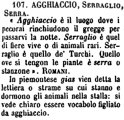 | Agghiaccio, Serraglio, Serra - « Agghiaccio è il luogo dove i pecorai rinchiudono il gregge per passarvi la notte. Serraglio è quel di fiere vive o di animali rari. Serraglio è quello de' Turchi. Quello ove si tengon le piante è serra o stanzone ». Romani.