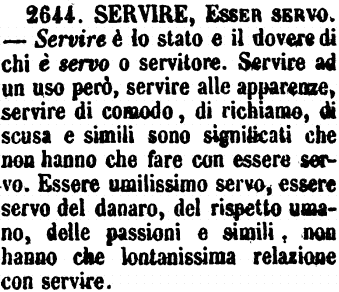 | Servire, Esser servo - Servire è lo stato e il dovere di chi è servo o servitore. Servire ad un uso però, servire alle apparenze, servire di comodo, di richiamo, di scusa e simili sono significati che non hanno che fare con essere servo. Essere umilissimo servo, essere servo del danaro, del rispetto umano, delle passioni e simili, non hanno che lontanissima relazione con servire. [immagine] |