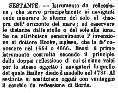 | Sestante - Istrumento da reflessione, che serve principalmente ai naviganti onde misurare le altezze del sole al disopra dell'orizzonte del mare; ed osservare le distanze dalle stelle o dal sole alla luna. Se ne attribuisce generalmente l'invenzione al dottore Hooke, inglese, che la fe' conoscere nel 1664 o 1666. Bensì il primo istrumento costruito secondo il principio della doppia reflessione di cui si siano valsi per lo stesso oggetto i navigatori fu quello del quale Hadley diede il modello nel 1731. Al sestante si sostituisce oggidì con vantaggio il cerchio da reflessione di Borda. [immagine] |