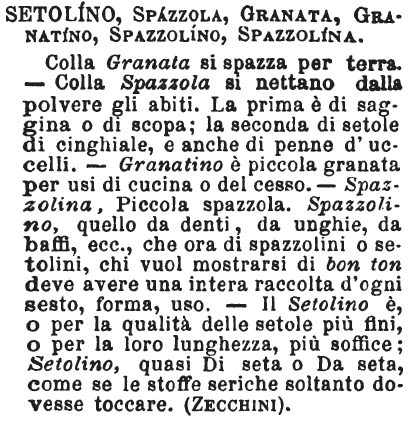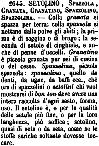 | Setolino, Spazzola, Granata, Granatino, Spazzolino, Spazzolina - Colla Granata si spazza per terra. - Colla Spazzola si nettano dalla polvere gli abiti. La prima è di saggina o di scopa; la seconda di setole di cinghiale, e anche di penne d'uccelli. - Granatino è piccola granata per usi di cucina o del cesso. - Spazzolina, Piccola spazzola. Spazzolino, quello da denti, da unghie, da baffi, ecc., che ora di spazzolini o setolini, chi vuol mostrarsi di bon ton deve avere una intera raccolta d'ogni sesto, forma, uso. - Il Setolino è, o per la qualità delle setole più fini, o per la loro lunghezza, più soffice; Setolino, quasi Di seta o Da seta, come se le stoffe seriche soltanto dovesse toccare. (Zecchini). [immagine] |
