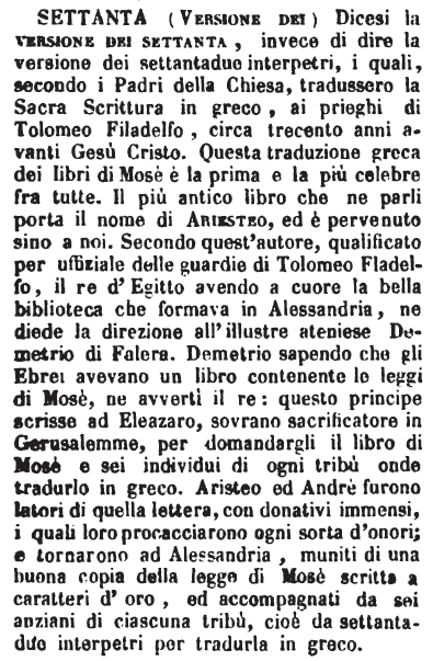 | Settanta (Versione dei) - Dicesi la Versione dei Settanta, invece di dire la versione dei settantadue interpetri, i quali, secondo i Padri della Chiesa, tradussero la Sacra Scrittura in greco, ai prieghi di Tolomeo Filadelfo, circa trecento anni avanti Gesù Cristo. Questa traduzione greca dei libri di Mosè è la prima e la più celebre fra tutte. Il più antico libro che ne parli porta il nome di Ariesteo, ed è pervenuto sino a noi. Secondo quest'autore, qualificato per ufficiale delle guardie di Tolomeo Filadelfo, il re d'Egitto avendo a cuore la bella biblioteca che formava in Alessandria, ne diede la direzione all'illustre ateniese Demetrio di Falera. Demetrio sapendo che gli Ebrei avevano un libro contenente le leggi di Mosè, ne avvertì il re: questo principe scrisse ad Eleazaro, sovrano sacrificatore in Gerusalemme, per domandargli il libro di Mosè e sei individui di ogni tribù onde tradurlo in greco. Aristeo ed Andrè furono latori di quella lettera, con donativi immensi, i quali loro procacciarono ogni sorta d'onori; e tornarono ad Alessandria, muniti di una buona copia della legge di Mosè scritta a caratteri d'oro, ed accompagnati da sei anziani di ciascuna tribù, cioè da settantadue interpetri per tradurla in greco. [immagine] |