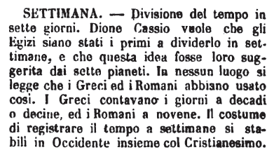 | Settimana - Divisione del tempo in sette giorni. Dione Cassio vuole che gli Egizi siano stati i primi a dividerlo in settimane, e che questa idea fosse loro suggerita dai sette pianeti. In nessun luogo si legge che i Greci ed i Romani abbiano usato così. I Greci contavano i giorni a decadi o decine, ed i Romani a novene. Il costume di registrare il tempo a settimane si stabili in Occidente insieme col Cristianesimo. [immagine] |
