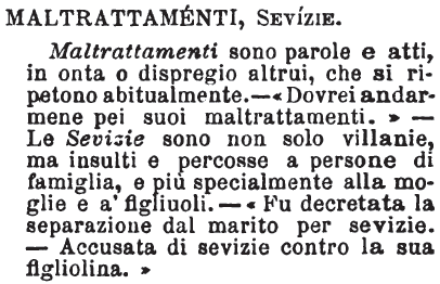 | Maltrattamenti, Sevizie - Maltrattamenti sono parole e atti, in onta o dispregio altrui, che si ripetono abitualmente. - «Dovrei andarmene pei suoi maltrattamenti.» - Le Sevizie sono non solo villanie, ma insulti e percosse a persone di famiglia, e più specialmente alla moglie e a' figliuoli. - «Fu decretata la separazione dal marito per sevizie. - Accusata di sevizie contro la sua figliolina.» [immagine] |