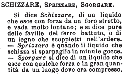 | Schizzare, Sprizzare, Sgorgare - Si dice Schizzare, di un liquido che esce con forza da un foro stretto, e vada molto lontano; e si dice pure delle faville del ferro battuto, o di un legno che scoppietti nell'ardere. - Sprizzare è quando il liquido che schizza si sparpaglia in minute gocce. - Sgorgare si dice di un liquido che esce con qualche forza e in gran quantità da un luogo dove era compresso. [immagine] |