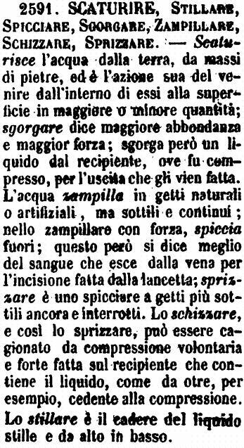 | Scaturire, Stillare, Spicciare, Sgorgare, Zampillare, Schizzare, Sprizzare - Scaturisce l'acqua dalla terra, da massi di pietre, ed è l'azione sua del venire dall'interno di essi alla superficie in maggiore o minore quantità; sgorgare dice maggiore abbondanza e maggior forza; sgorga però un liquido dal recipiente, ove fu compresso, per l'uscita che gli vien fatta. L'acqua zampilla in getti naturali o artifiziali, ma sottili e continui; nello zampillare con forza, spiccia fuori; questo però si dice meglio del sangue che esce dalla vena per l'incisione fatta dalla lancetta; sprizzare è uno spicciare a getti più sottili ancora e interrotti. Lo schizzare, e così lo sprizzare, può essere cagionato da compressione volontaria e forte fatta sul recipiente che contiene il liquido, come da otre, per esempio, cedente alla compressione. Lo stillare è il cadere del liquido stille e da alto in basso. [immagine] |