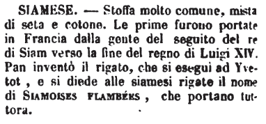 | Siamese - Stoffa molto comune, mista di seta e cotone. Le prime furono portate in Francia dalla gente del seguito del re di Siam verso la fine del regno di Luigi XIV. Pan inventò il rigato, che si eseguì ad Yvetot, e si diede alle siamesi rigate il nome di Siamoises flambées, che portano tuttora. [immagine] |