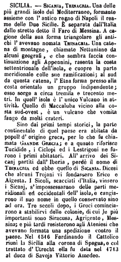 | Sicilia - Sicania, Trinacria. Una delle più grandi isole del Mediterraneo, formante assieme con l'antico regno di Napoli il reame delle Due Sicilie. E' separata dall'Italia dallo stretto detto il Faro di Messina. A cagione della sua forma triangolare gli antichi l'avevano nomata Trinacria. Una catena di montagne, chiamate Nettuniane da alcuni geografi, e che sembra faccia continuazione agli Appennini, rasenta la costa settentrionale dell'isola, e cuopre la parte meridionale colle sue ramificazioni; al sud da questa catena, l'Etna forma presso alla costa orientale un gruppo indipendente; esso sorge a circa tremila e trecento metri. In quell'isola è l'unico Vulcano in attività. Quello di Maccaluba vicino alla costa sud-ovest, è un vulcano che vomita fango da molti crateri.
