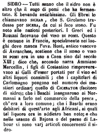 | Sidro - Tutti sanno che il sidro non è altro che il sugo di pomi che ha fermentato. È bevanda antichissima. Gli Ebrei lo chiamavano sichar, che S. Girolamo tradusse per sicera, da cui si fece sidro. Fu noto alle nazioni posteriori. I Greci ed i Romani facevano del vino di pomi. Questo è comune in Francia, specialmente nei luoghi dove manca l'uva. Huet, antico vescovo di Avranches, sostiene che il sidro o vino di pomi era in uso a Caen sino dal secolo XIII; dice che, secondo narra Ammiano Marcellin, i figli di Costantino rimproveravano ai Galli d'esser portati per il vino ed altri liquori consimili; che i capitolari di Carlomagno pongono nel numero dei mestieri ordinarj quello di cicerator (facitore di sidro); che i Baschi insegnarono ai Normanni a farlo nel commercio della pesca, ch'era a loro comune; che i Baschi erano debitori di quest'arte agli Africani, ai quali tal liquore era in addietro ben noto; e che nelle usanze di Bajona o del paese di Labour vi sono varj articoli concernenti il sidro. [immagine] |