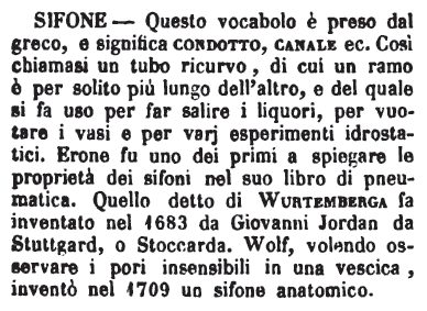 | Sifone - Questo vocabolo è preso dal greco, e significa condotto, canale ec. Così chiamasi un tubo ricurvo, di cui un ramo è per solito più lungo dell'altro, e del quale si fa uso per far salire i liquori, per vuotare i vasi e per varj esperimenti idrostatici. Erone fu uno dei primi a spiegare le proprietà dei sifoni nel suo libro di pneumatica. Quello detto di Wurtenberga fa inventato nel 1683 da Giovanni Jordan da Stuttgard, o Stoccarda. Wolf, volendo osservare i pori insensibili in una vescica, inventò nel 1709 un sifone anatomico. [immagine] |