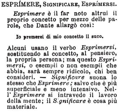 Io premerei di mio concetto il suco. Alcuni usano il verbo Esprimersi, sostituendo al concetto, al pensiero, la propria persona; ma questo Esprimersi, o esempii o non esempii che abbia, sarà sempre ridicolo, chi ben consideri. - Significare suona lo stesso che Esprimere; salvo che è più superficiale e meno intensivo. Nell'Esprimere si intravede il lavoro della mente; il Significare è cosa più materiale. [immagine] |