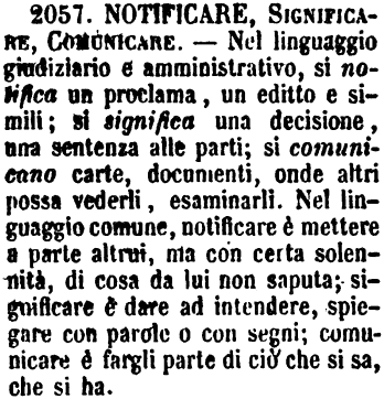 | Notificare, Significare, Comunicare - Nel linguaggio giudiziario e amministrativo, si notifica un proclama, un editto e simili; si significa una decisione, una sentenza alle parti; si comunicano carte, documenti, onde altri possa vederli, esaminarli. Nel linguaggio comune, notificare è mettere a parte altrui, ma con certa solennità, di cosa da lui non saputa; significare è dare ad intendere, spiegare con parole o con segni; comunicare è fargli parte di ciò che si sa, che si ha. [immagine] |