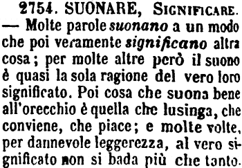 | Suonare, Significare - Molte parole suonano a un modo che poi veramente significano altra cosa; per molte altre però il suono è quasi la sola ragione del vero loro significato. Poi cosa che suona bene all'orecchio è quella che lusinga, che conviene, che piace; e molte volte, per dannevole leggerezza, al vero significato non si bada più che tanto. [immagine] |