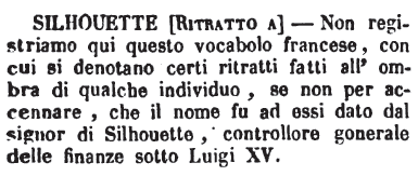 | Silhouette (Ritratto a) - Non registriamo qui questo vocabolo francese, con cui si denotano certi ritratti fatti all'ombra di qualche individuo, se non per accennare, che il nome fu ad essi dato dal signor di Silhouette, controllore generale delle finanze sotto Luigi XV. [immagine] |